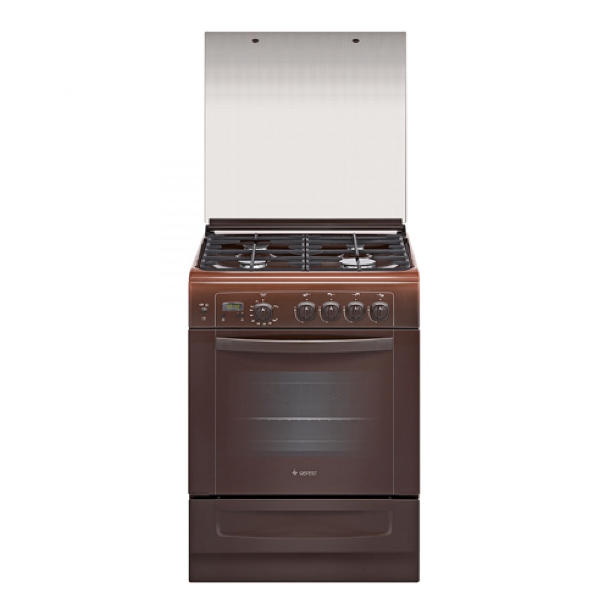 Газовая плита GEFEST 6100-03 0003 выполнена в коричневом корпусе из эмалированной стали. Она предлагает 4 конфорки с чугунными решетками и духовой шкаф объемом 52 л. Режимы «Гриль» и «Нижний нагрев» позволяют готовить сочные блюда и выпечку. На панели управления расположены поворотные переключатели и дисплей с часами. Электронный таймер со звуковым сигналом позволяет устанавливать определенное время запекания. \nФункция электроподжига исключает необходимость в средствах розжига – конфорки активируются при повороте переключателя от искры. Система «Газ-контроль» автоматически перекрывает подачу топлива в случае внезапного затухания пламени. Подсветка помогает контролировать степень готовности блюда в духовом шкафу. Внизу предусмотрен выдвижной ящик, в котором удобно хранить посуду и принадлежности. В наборе с плитой GEFEST 6100-03 0003 поставляются противень, жаровня и решетка.