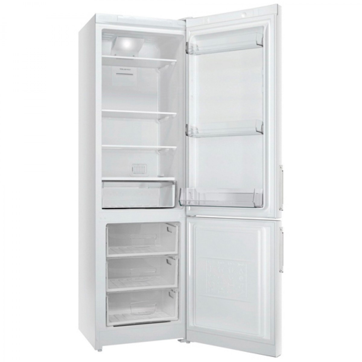 Холодильник Stinol STN 200 D − функциональный холодильный агрегат, представленный в белом корпусе размерами 60x200x64 см. Общая вместительность устройства соответствует 324 л: 249 л занимает холодильное отделение, а 75 л отводится морозильной камере, расположенной в нижней части корпуса. Для разделения пространства в низкотемпературном отделении используются ящики с прозрачными стенками, что облегчает хранение и поиск продуктов. В верхней камере предусмотрены четыре полки и широкий ящик для фруктов и овощей. Закаленное стекло применяется в качестве материала для полок, что позволяет им выдерживать большие нагрузки. \nНа верхней дверце находится дисплей, отображающий показатель температуры в каждой камере. Особенность Stinol STN 200 D в использовании системы No Frost в обеих камерах. Это способствует получению всех условий для длительного хранения продуктов, исключает образования инея на стенках камеры, а также наледи на продуктах. Режимы «Суперохлаждение» и «Суперзаморозка» обеспечивают быстрое доведение продуктов до оптимальных показателей.