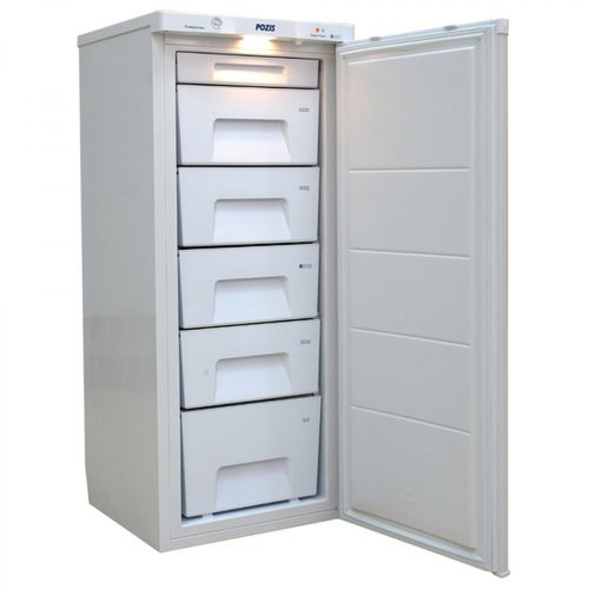 Морозильный шкаф Pozis FV-115 – однокамерный однокомпрессорный прибор для замораживания продуктов. Размеры устройства – 130x54x55 см. Полезный объем морозильного шкафа составляет 111 л, замораживающая способность морозильника – 9.5 кг в сутки. Компрессор прибора, обеспечивающий охлаждение внутри камеры, работает на изобутане R600a. Этот хладагент используется в моделях морозильных устройств и отличается экологичностью и безопасностью. \nМорозильный шкаф Pozis FV-115 не искажает вкусовых качеств и полезных свойств продуктов при заморозке благодаря режиму \"Super Frost\". Устройство имеет 6 отделений, снабженными цельными литыми корзинами. Такие корзины легко открываются вне зависимости от их загруженности и отличаются особой прочностью. Дверцу прибора возможно установить так, чтобы она открывалась как в одну, так и в другую сторону. Ручное размораживание морозильного шкафа надолго продлит срок его службы. Верхнее покрытие прибора – пластик белого цвета.