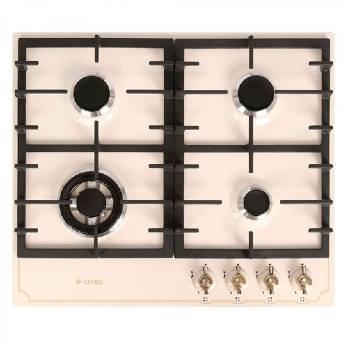 Газовая варочная поверхность Gefest ПВГ 1214-01 К55 с красивой бежевой панелью и 4-мя конфорками отлично впишется в кухонный интерьер. Эмалированная плита легко очищается даже от пригоревшей и присохшей пищи. Составные решетки можно снять, чтобы быстрее и проще убрать загрязнения. \nПлита Gefest ПВГ 1214-01 К55 оснащена удобными рычагами со встроенным электроподжигом, благодаря чему вам не потребуются спички. Вы можете плавно настраивать температуру нагрева и фиксировать переключатели в положении «малое пламя». Газ-контроль отключит подачу газа при внезапном погашении пламени, а одна из конфорок имеет форму «двойной короны» для сильной обжарки.